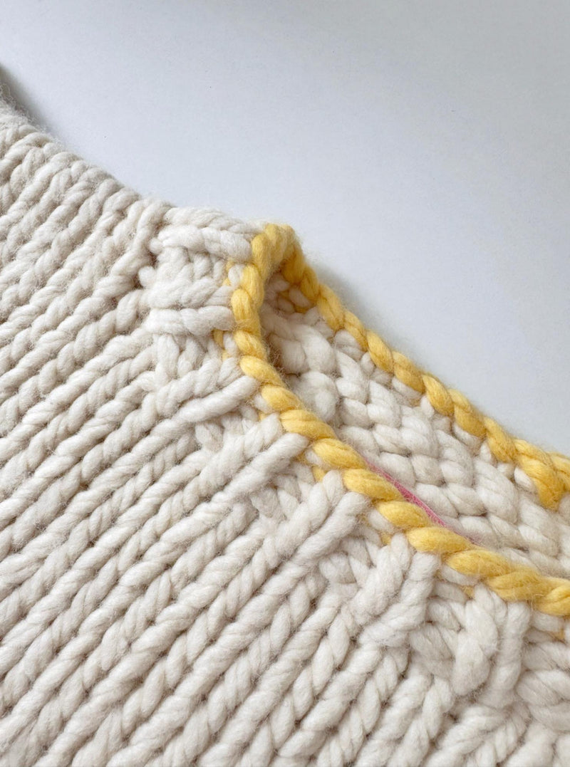 This jumper was suppose to have yellow tipping on the cuff to match the neckline and hem. You have the option to add this or keep it as photographed.