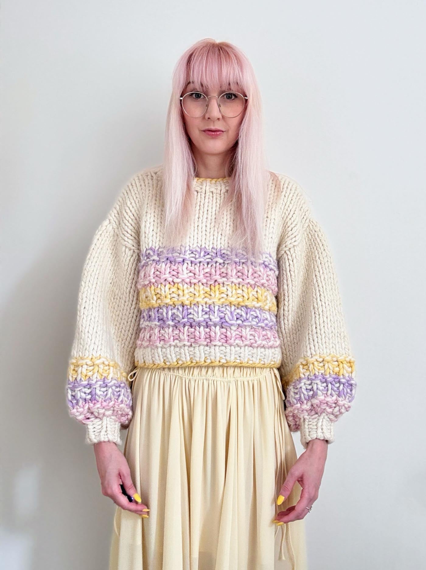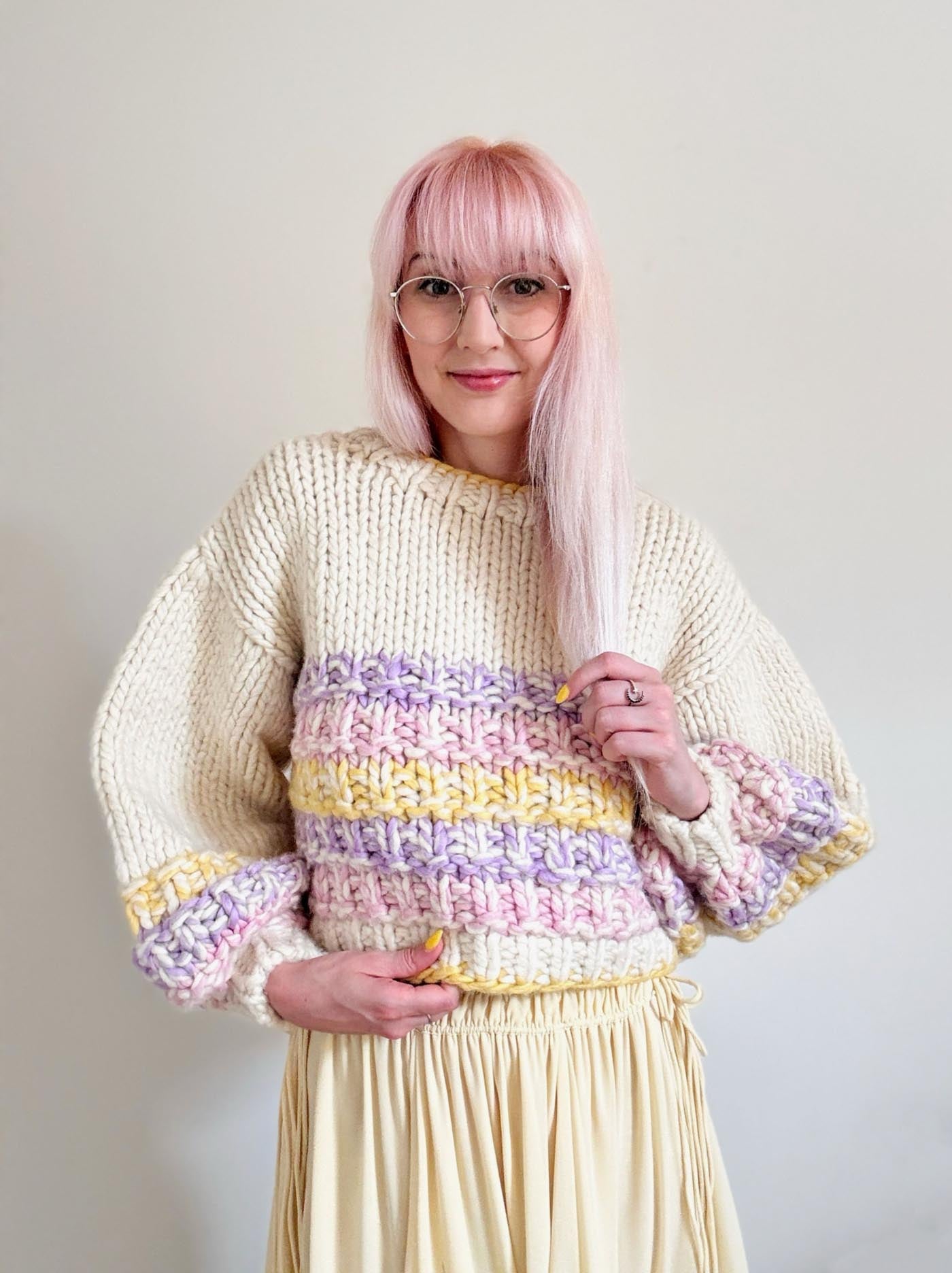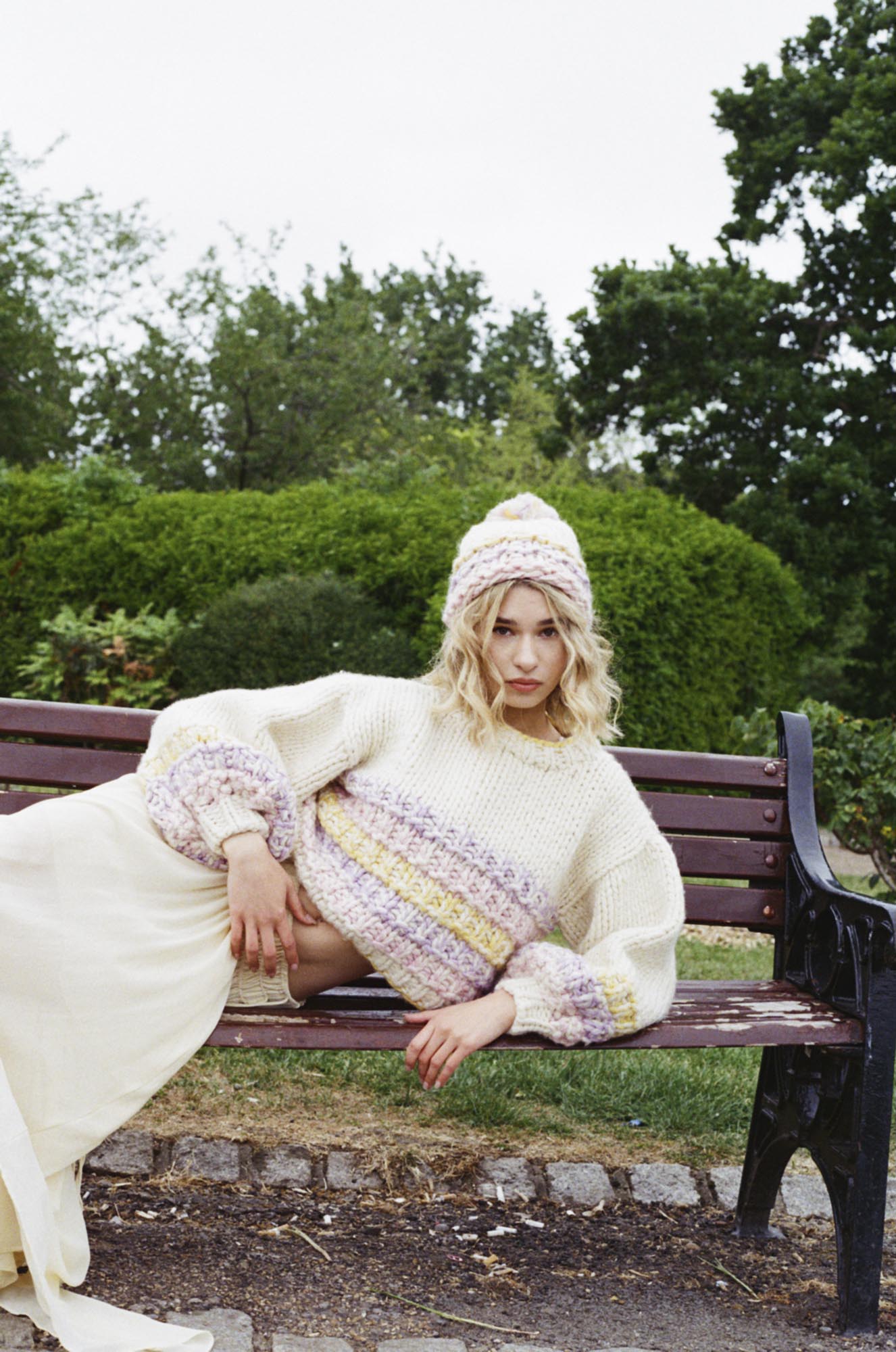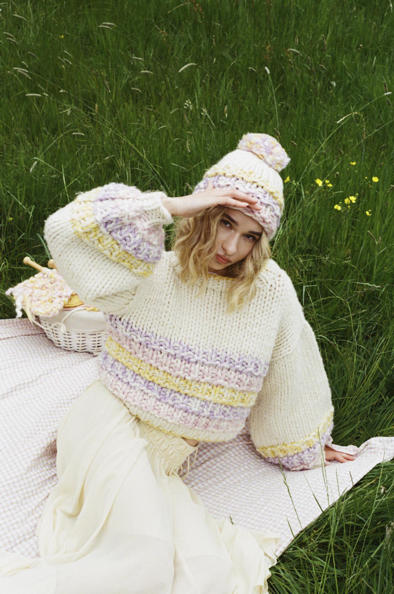 Meet the Hurdle Up Jumper. This jumper is hand-knitted in luxuriously soft 100% merino wool, featuring a bold, chunky texture that’s equal parts statement and snug. Its unique hurdle stitch pattern (get the name now) gives it a beautifully tactile feel, with pastel pops of lilac, lemon, and pink, making it your new go to jumper when you want to feel cute and cosy