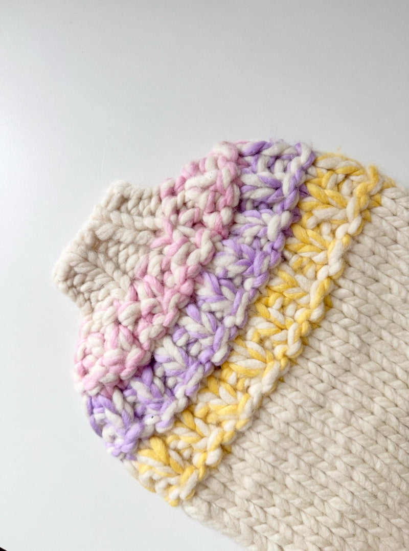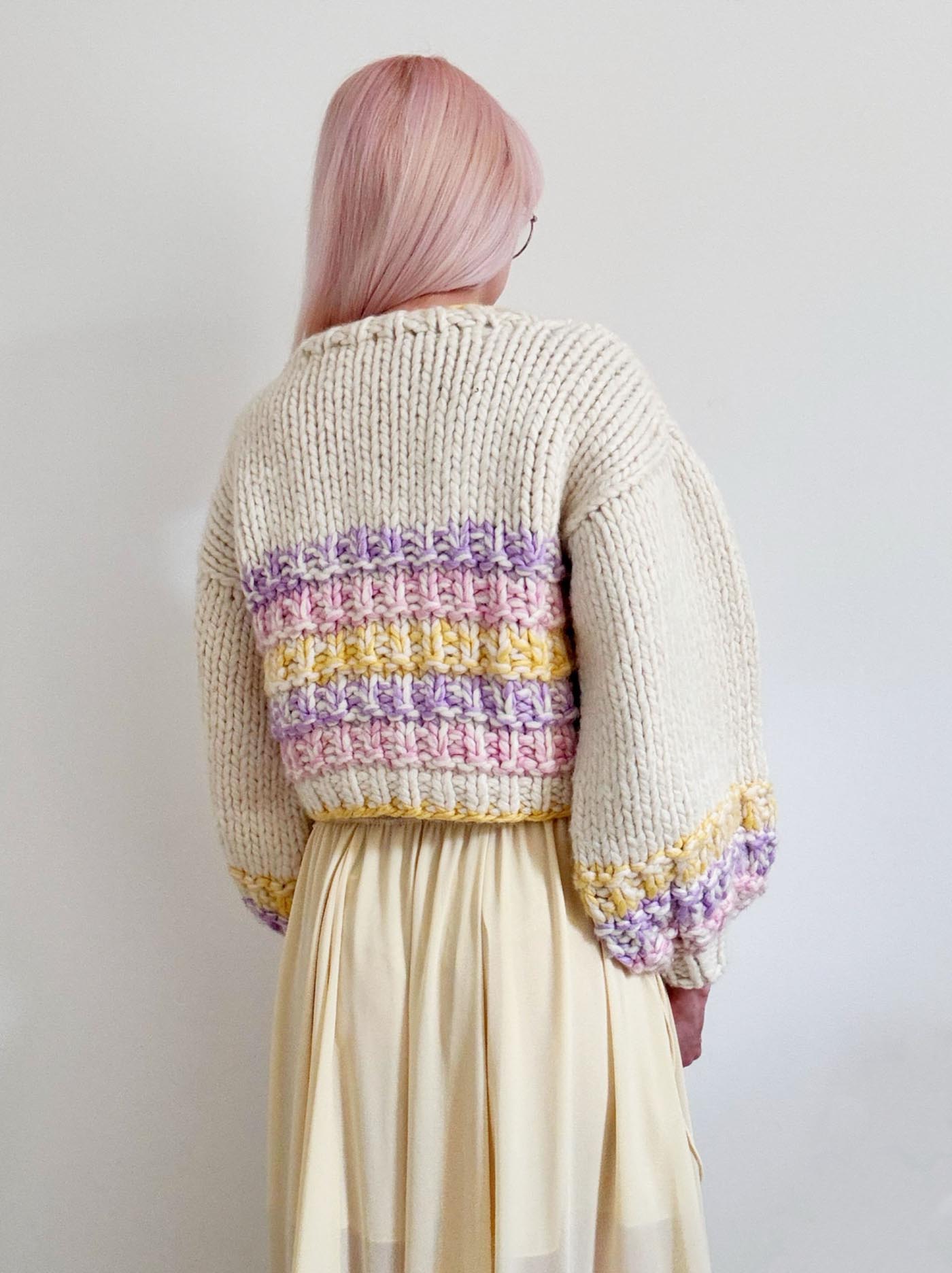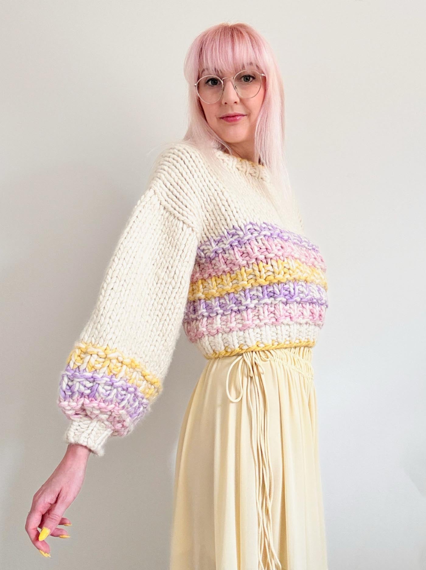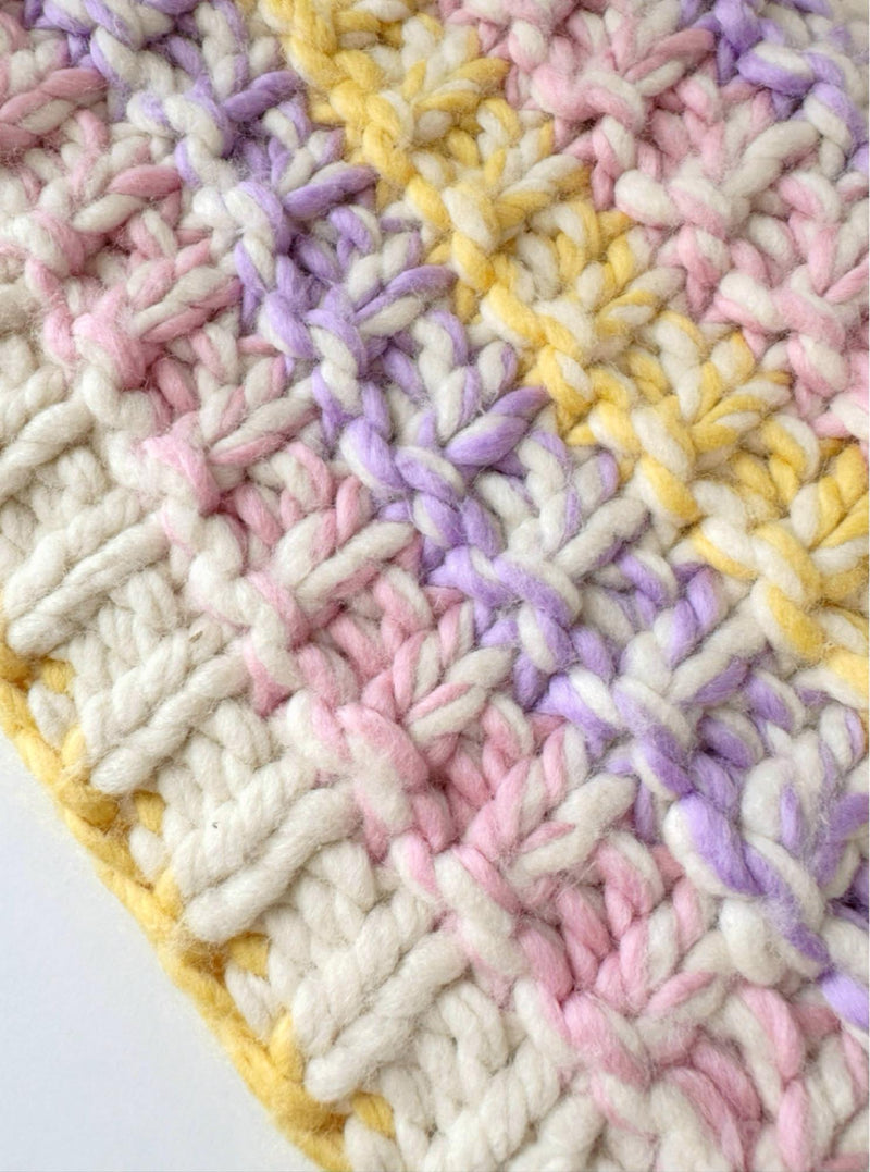 Meet the Hurdle Up Jumper. This jumper is hand-knitted in luxuriously soft 100% merino wool, featuring a bold, chunky texture that’s equal parts statement and snug. Its unique hurdle stitch pattern (get the name now) gives it a beautifully tactile feel, with pastel pops of lilac, lemon, and pink, making it your new go to jumper when you want to feel cute and cosy