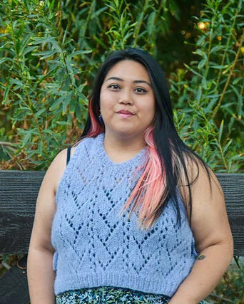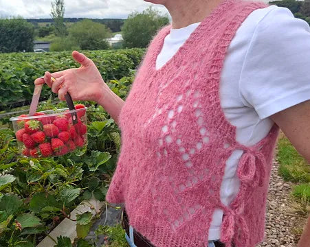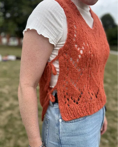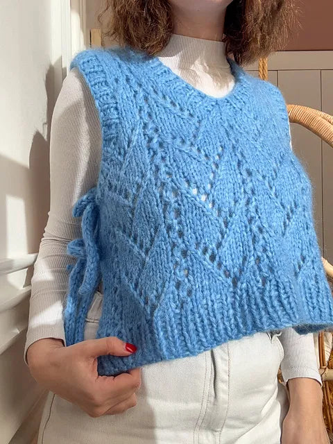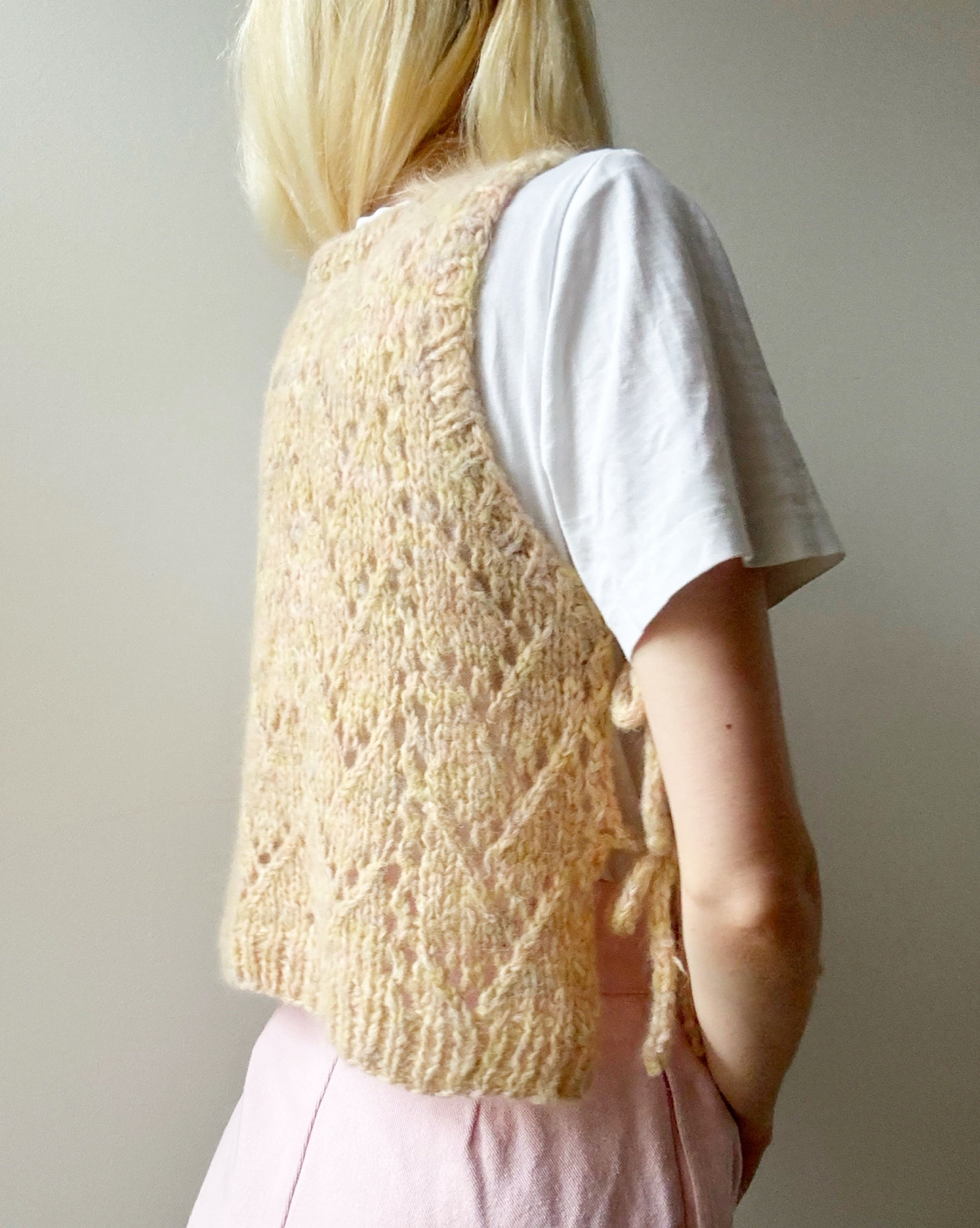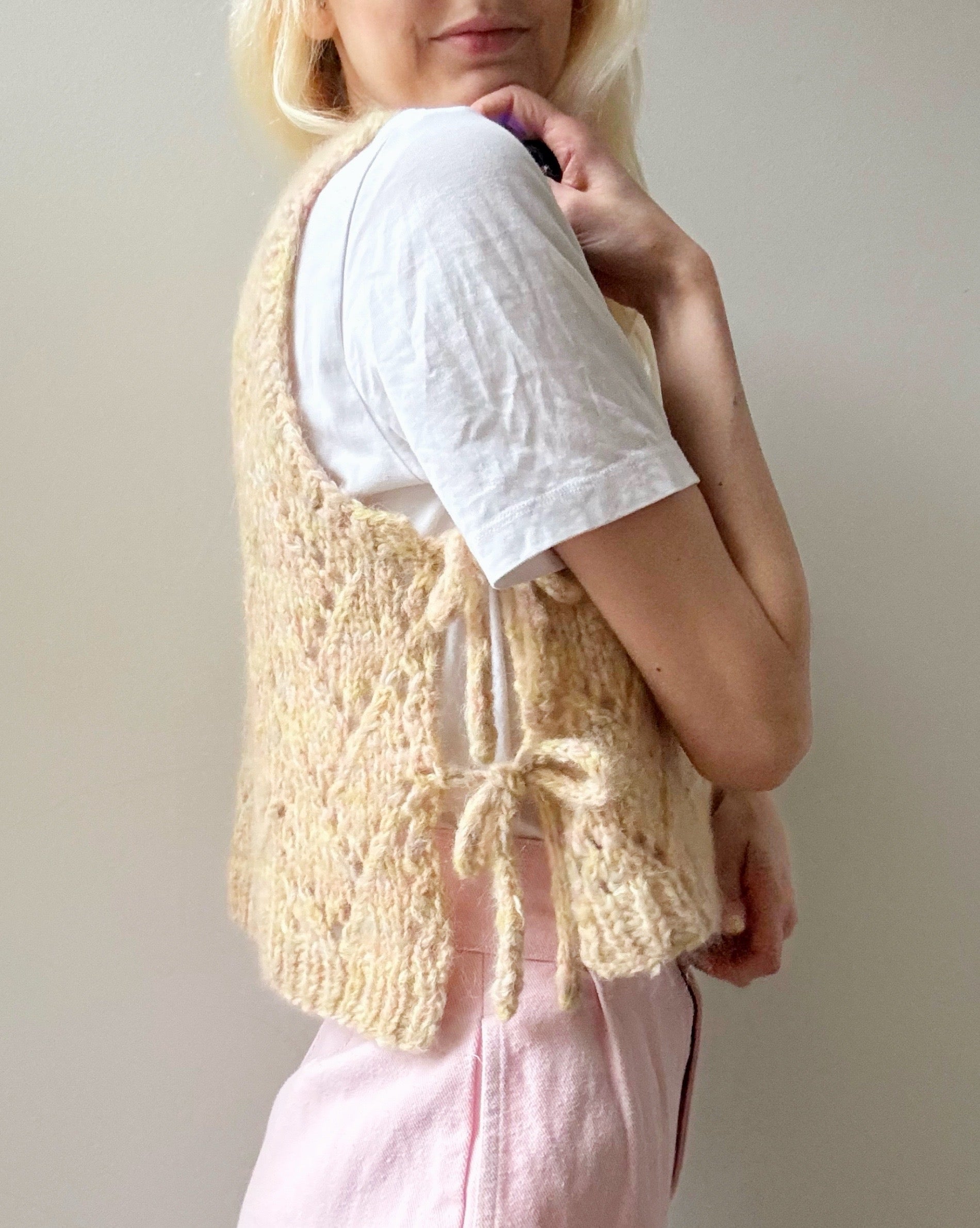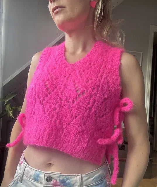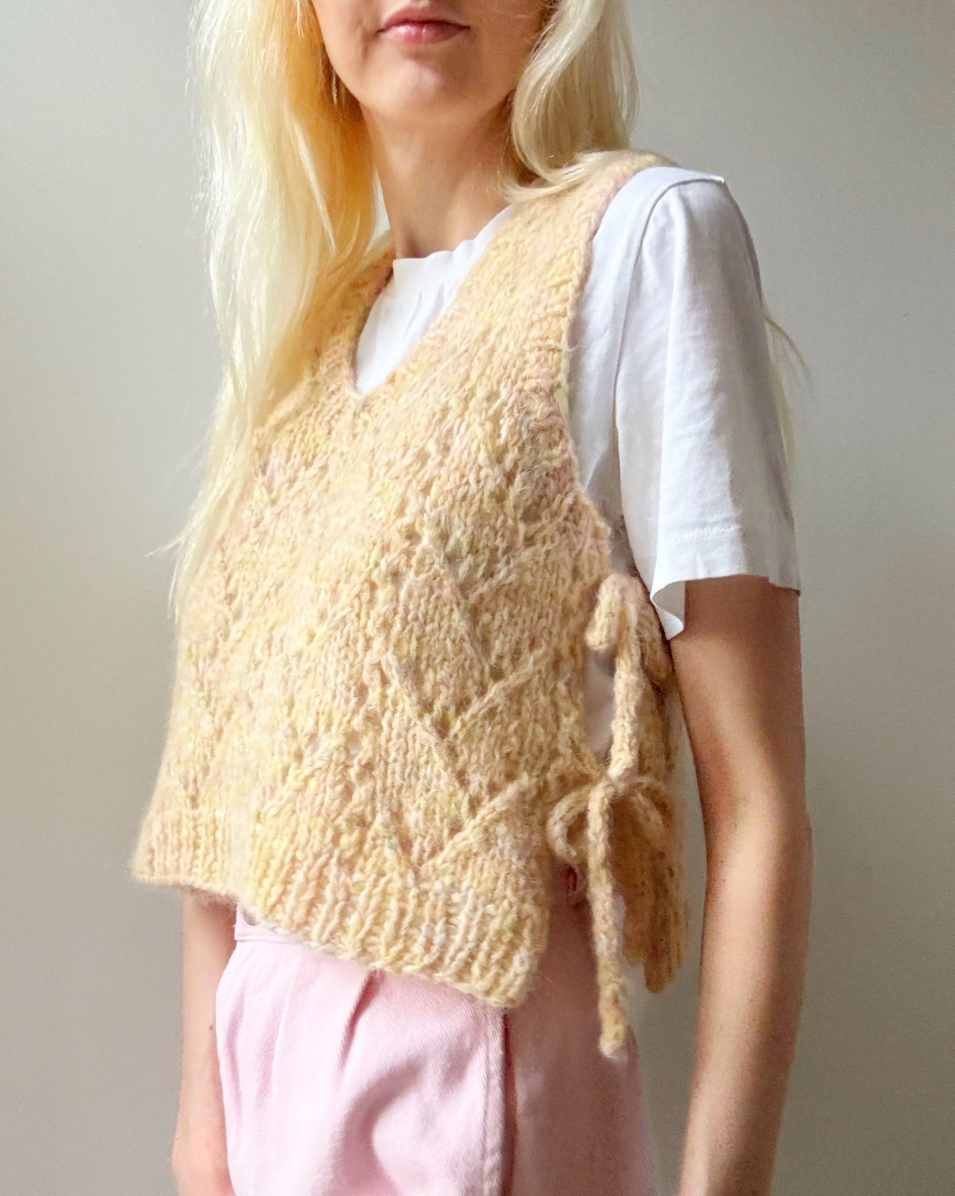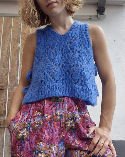This super cute V neck all over lace vest is the ultimate layering staple. Super light, airy and fluffy and made in baby suri, makes for the softest piece in your wardrobe. Fastened together with two little ties on either side, giving you the flexibility to tighten and loosen the design as your body and outfit changes. It’s slightly oversized and boxy creating the softest drape and hang on your body. If you are looking for a project to concentrate on and stop your brain thinking about life, this is the perfect project to escape your troubles and take you into a knitting bubble.