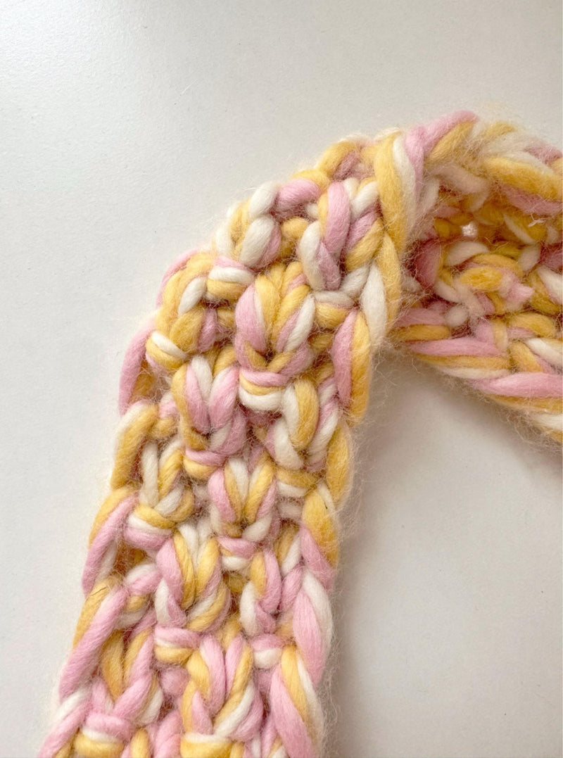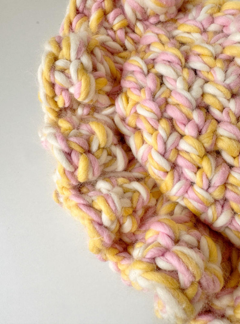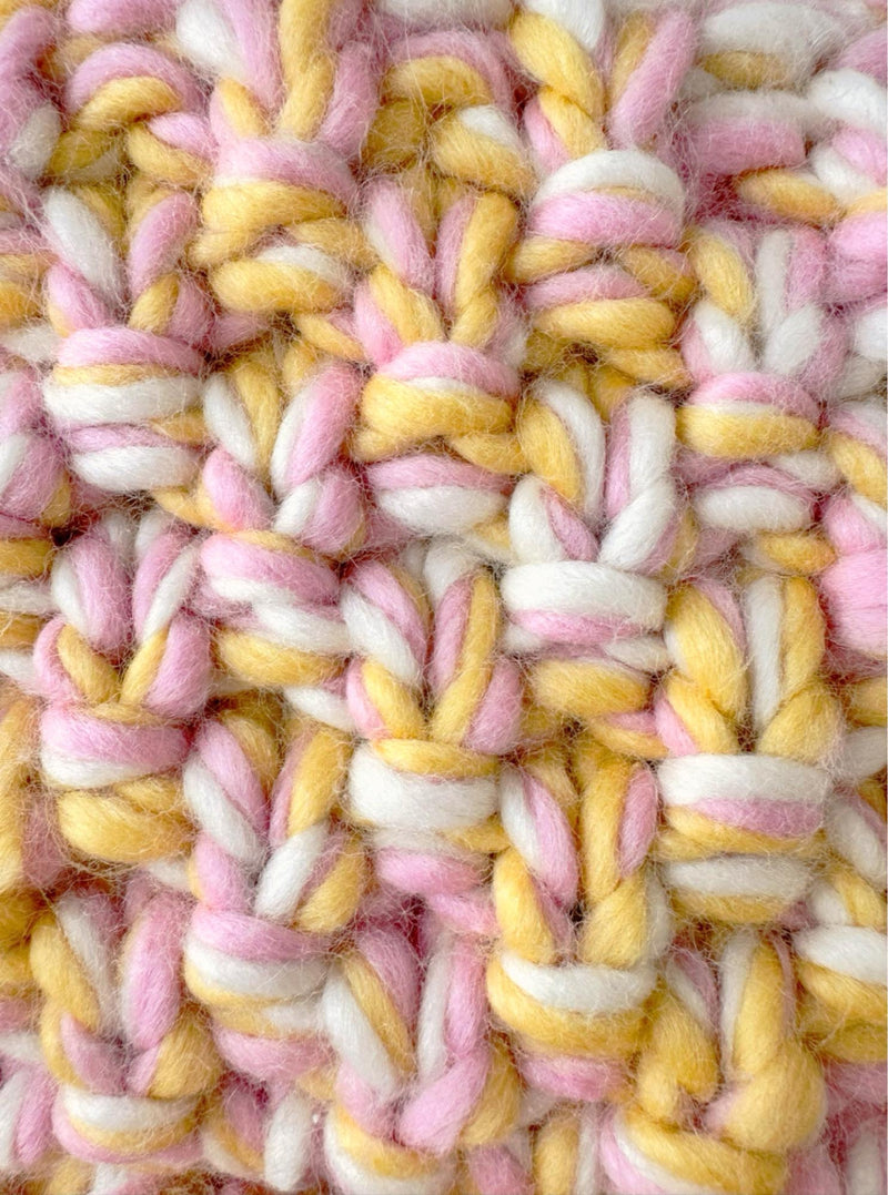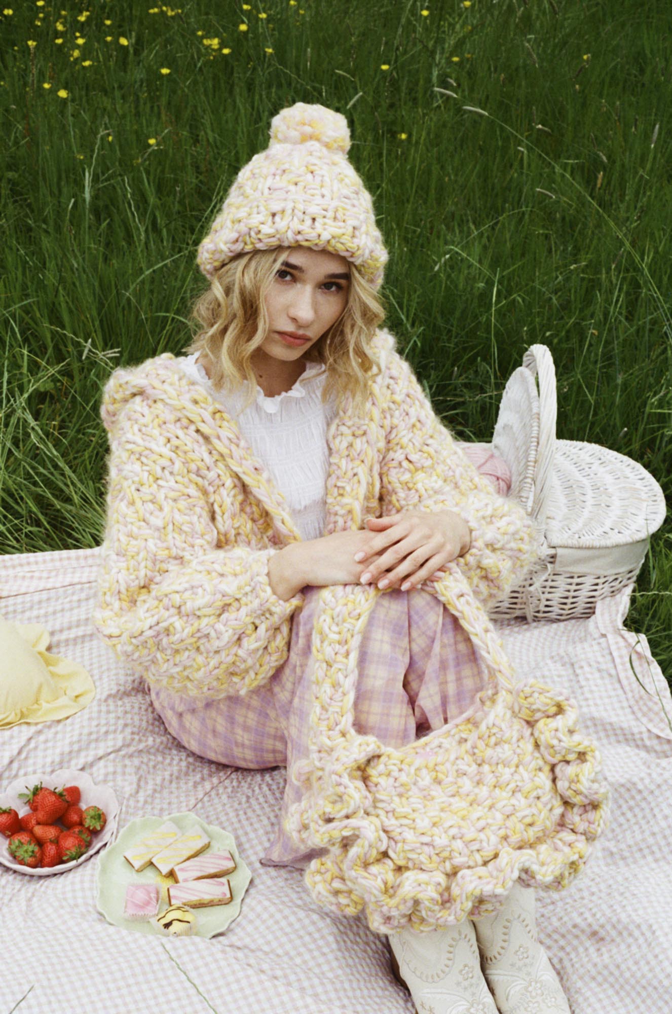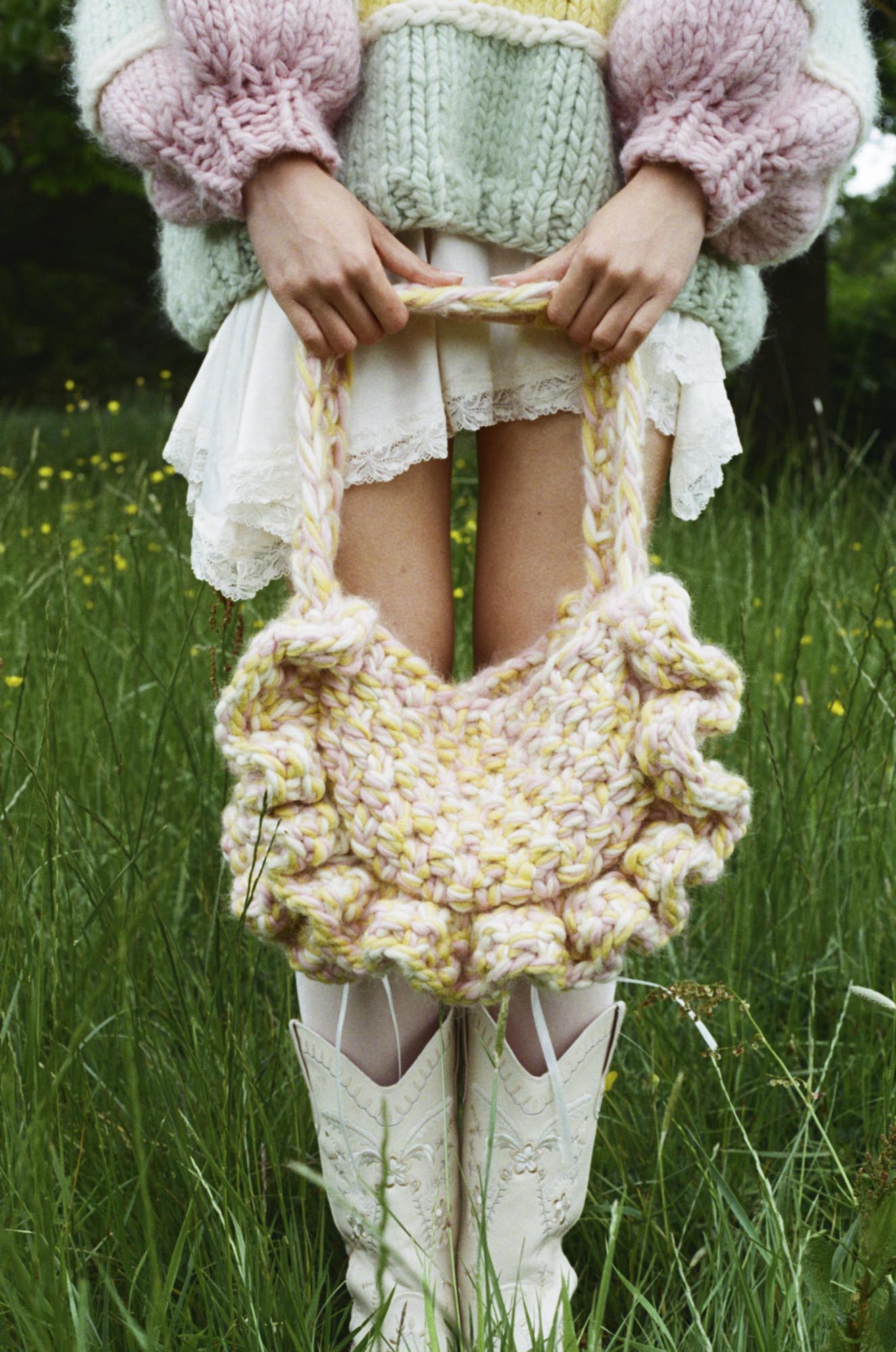 Meet the Mallow Out Frill Bag. She’s here to sweeten your outfit and soften your day. Hand-knitted in luxuriously soft 100% merino wool in a pastel swirl of candy pink, buttery yellow, and creamy white merino wool, it’s giving marshmallow (get the name now?) dreamyness.