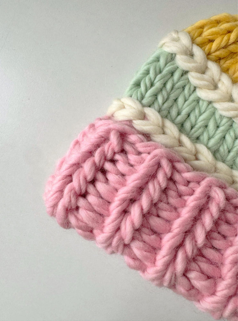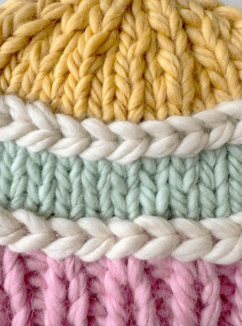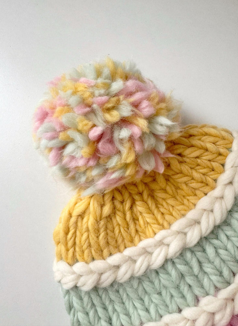 A pastel dream come true, meet the Stripe a Pose Beanie. It is hand-knitted in luxuriously soft 100% merino wool, combining crochet and knit techniques to create bold, candy stripes that feel as good as they look. Think sunshine yellow, candy pink, icy mint, and creamy white - topped with a multi-color pom-pom (optional) that brings a next level of cute.